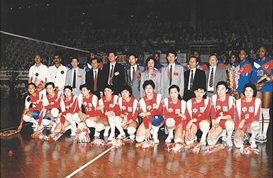 时富集团董事长朱正贤赞助中国女排与古巴女排在台上举行对抗赛