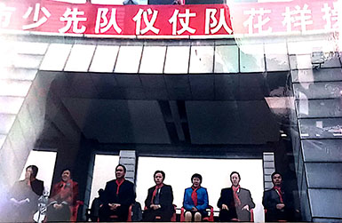 2002年12月14日,东莞市少年先锋队第六次代表大会上,广东省政协常委、东莞时富花园董事长朱正贤先生(右二)与东莞人大等领导一起观看仪仗队花样体操表演
